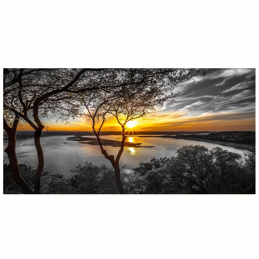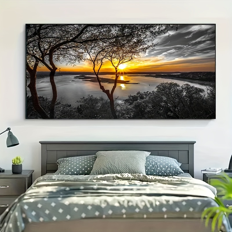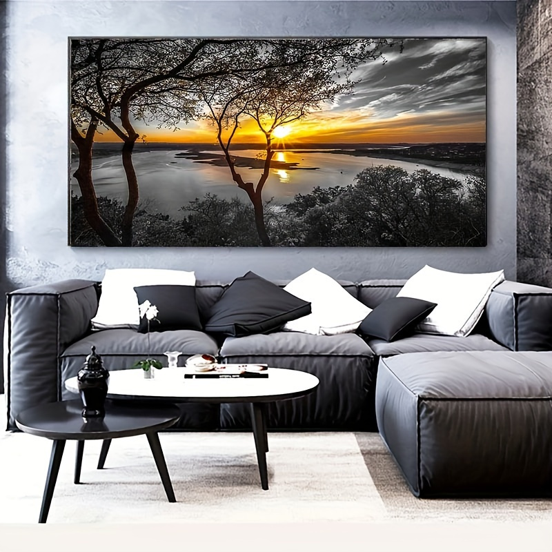 Modern Black White Sunset Canvas Wall Art - Wooden Framed Landscape Print, Contemporary Home Office Decor for Living Room Bedroom Bathroom (16x24 Inch)